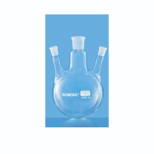 The Round Bottom Flask – 3 Necks Parallel by BOROSIL is a high-quality laboratory flask designed for complex chemical reactions requiring multiple access points. Made from durable borosilicate glass, it offers excellent thermal resistance, uniform wall thickness, and chemical stability, making it ideal for heating, boiling, and distillation processes.